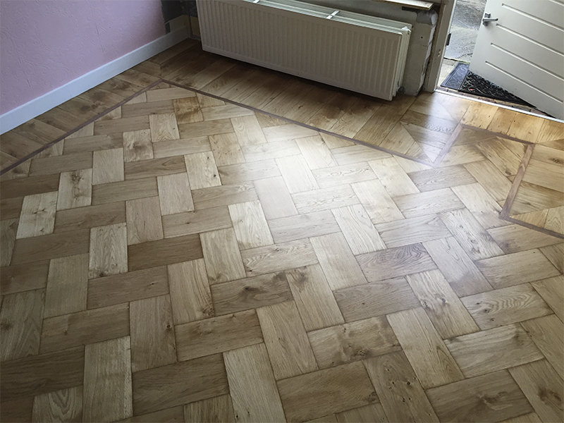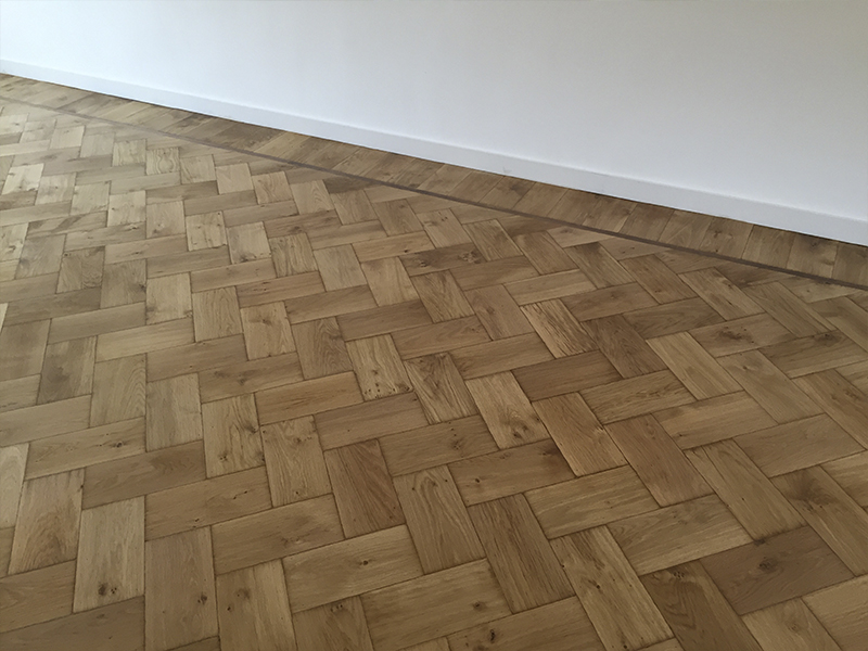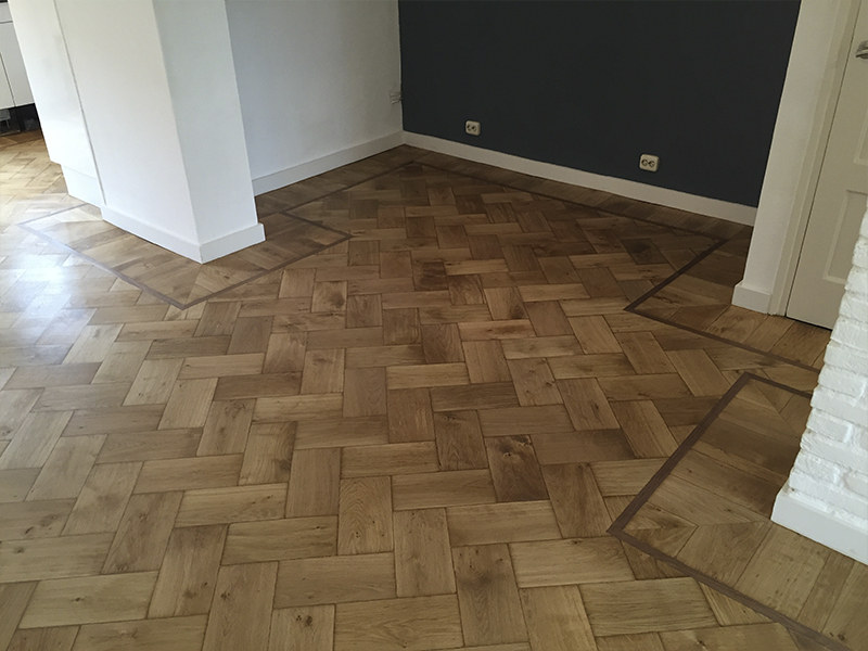 Eiken visgraat vloer, met kambala bies en eiken staande kant geschuurd en gelakt met matte lak.